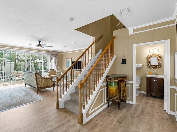 End unit townhouse in sought after Fairfield of East Boca a man-gated community. Largest model. 3 bedrooms and 2.5 bathrooms, 2 car garage, plus a private entry walk up. Located in the heart of Central Boca Raton by Town Center Mall, walking distance to Boca Center, close to 1- 95, turnpike, A+ schools, entertainment and a short drive to Boca's beautiful beaches. Bonus can rent right away. Open floor plan and ample amounts of natural light. Large, screened patio and wood railing staircase. Brand new exquisite kitchen with abundant cabinet space, quartz countertops and granite backsplash. Enjoy the ease of maintenance and the elegance of new laminate flooring throughout. Second floor has a split bedroom plan. Large primary with grand ensuite, double sink vanity, tub and walk-in shower. Laundry room with full sized washer & dryer. Lots of closet and storage space. 2 car garage has recently been updated with a custom epoxy floor. Elegant plantation shutters adorn the windows. Attention to detail with custom moldings throughout. No popcorn and New garage door opener. This home has been impeccably maintained. The gated community of Fairfield offers lake side pools, tennis courts, racquetball, basketball, clubhouse with onsite manager.