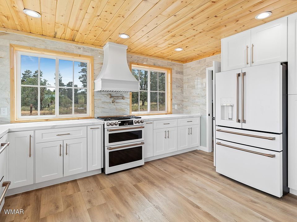 Absolutely incredible opportunity to own this new build property on a spectacular acreage in Pinedale! The property boasts high-end finishes and custom design throughout. The chef's kitchen is sure to win over even the most particular of buyers- The white cabinetry is perfectly complimented by porcelain countertops, custom marble backsplash, custom wood tone hood, and high-end café brand appliances. The pine tongue and groove ceiling brings a cozy luxury feel throughout. The bathrooms feature high end custom finishes. Plumbing upgrades include high-end fixtures throughout,a Navien tankless hot water heater, and a 2000 gallon septic tank to accommodate an additional potential future home build. Metal roof & spray foam insulation. 30 & 50 amp RV hook up & sewer hookup. HORSE property.