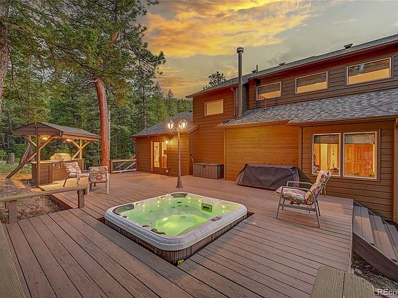 Perfect package - Mt. Evans views, usable land, lovely home in impeccable condition and just a short walk to hundreds of acres of open space. Ideal fusion of privacy but not isolated, this home offers large entertaining spaces inside and out. Inside has flowing living/dining areas that capture mountain views and are close to the kitchen. Outside entertaining includes a sprawling deck with built-in hot tub (totally private!), built-in grill area, and multiple sitting areas. The kitchen offers updates including grantie counters, double oven, counter with barstools, mtn views from sink and 2 pantrys. All the bedrooms are huge. On the main level, one has built-in bookshelves, the other has a window ledge. The upper level is all primary suite. The large bedroom enjoys Mt. Evans views from a private deck. The bathroom features a separate soaking tub with the same great views. Huge walk-in closet too. The walk-out lower level has a family room and a wet bar. The bedroom that can easily serve as a bedroom and double as an office or workout space. There is extra storage in the garage and shed. Surprisingly, the back of the home has gentle land and the front has a space for RV parking. Extra parking too. So many outdoor living opportunities too. Around 10 minutes to downtown Evergreen. This home really has everything.