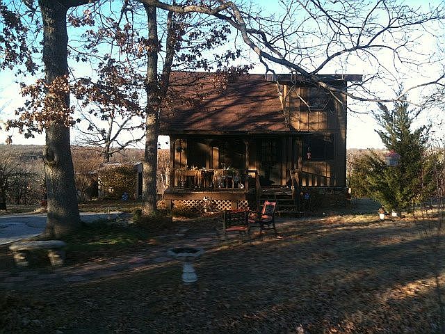 Situated in the Osage Hills. Peaceful retreat wooded 5 ac M/L, pond + cabin home. Open plan, wood stove, computer area, wood floors, 1/2 bath downstairs & upstairs is bedroom & bath, covered wood deck patio in front and open patio in back.