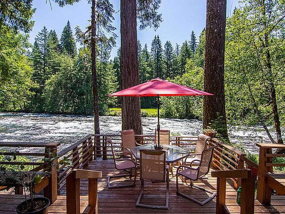 Mesmerizing 600 ft of beautiful crystal clean McKenzie river frontage is a rare find and an unusual opportunity to enjoy fresh air, sunshine, vegetable and flower gardens, 15 fruit trees including pear, plum and apple. Meander through tall old growth fir trees and down a pathway to the sandy beach with river access and sunshine, a great place for the evening social hour. Privacy and rushing river frontage from the lower main deck of this beautiful log home. Designed for river views from every room. Two master suites for separation of space. Main level master has a full bath, walkin shower, double sinks and a door that opens onto a deck with an oversized hot tub. The loft master suite has a balcony with fabulous river views and a full bathroom. Two story stone fireplace in the living room. Formal dining room. Chef up a meal for friends in the open kitchen while your guests sit at the eating bar and enjoy hors d' ouvres. Gas cook top. Pantry and 1/2 bath off the kitchen. Utility room/ home office combination with nice river and garden views. There is another 1/2 bath on the main level for guests. No need to drive to town to work, high speed internet. 3rd bedroom is being used for a second office. Now you can work and play all in the same place. Shop is wired with 3 different circuits and has a wash sink. Attached to the shop is another carport and behind the shop is a pole barn/wood shed. Shop could be converted back to a garage. RV parking. The covered front porch is the perfect way to enter this lovely and inviting river front home. This one is a real keeper, don't let it get away~ Only minutes from all the recreation the McKenzie River Valley has to offer. Fishing, rafting, hiking and biking trails, skiing, lakes, paddle boarding, resorts and cafes all close by, the perfect property to enjoy social distancing and get away from the crowds.
