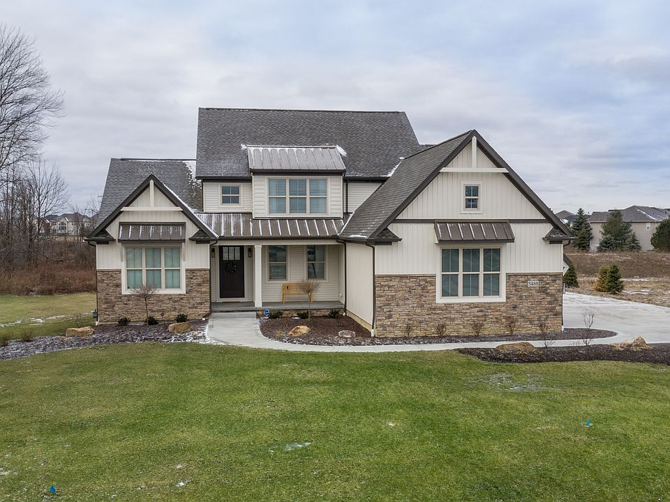 Unexpected relocation makes this fantastic nearly new "Arts & Crafts" style home available, situated on over 2 acres in prime location in historic Richfield. Home boasts grand 2 story great room that flows into the open kitchen and dining area with coffered beamed ceiling overlooking the covered patio. High end Luxury Vinyl flooring, and LED lighting in unique metal fixtures throughout main floor. Foyer leads to private study. Kitchen with SS Frigidaire appliances including 5 burner gas cooktop, 3 door refrigerator, convection oven and microwave, granite counters, crown molding, and Maple Cabinetry with self-close hinges. Pantry and utility/mud room with 2 year old washer and dryer that may remain. Deluxe Master Suite with tray ceiling with crown molding inlay offers private bath with oversized ceramic tile shower and soaking tub, dual sinks, and fabulous walk-in closet with built-ins. Custom blinds throughout. Second floor offers 3 spacious bedrooms, each with ceiling fans and ample closets. Bedrooms 2 and 3 adjacent to hall bath with quartz counter, dual sinks and shower over tub. 4th bedroom has en suite bath with tile floor and granite counter. All baths feature furniture finish vanities. 13 course lower level has fabulous finished rec room and play area, half bath and tremendous storage. Roof has some metal accents. Final seeding and landscaping will be completed Spring of 2020. Home is built by Modern Home Concepts with unsurpassed quality!