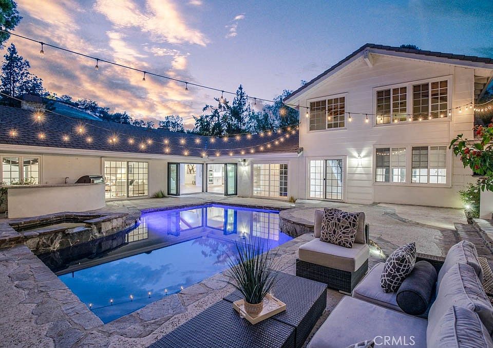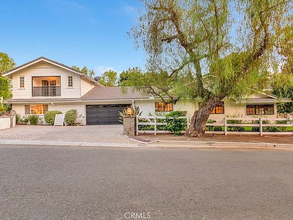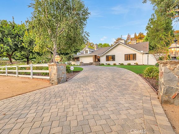 Located on one of the most desirable streets in the highly sought after prestigious gated equestrian community of Hidden Hills, this charming Craftsman home invites you in through its wide circular driveway, white picket fence, mature trees and lush landscaping on massive lot! Enter through the modern farmhouse double doors and be prepared to have your breath taken away! Wide plank Oak wooden floors and wood beam ceilings accentuate the light filled entryway, living room, family room and kitchen. Designer painted interior and floor to ceiling stone fireplace brings warmth and luxury to this magical place you'll want to call home. The perfectly open floorplan makes it easy to navigate from the living room with bi-fold doors that open up to indoor/outdoor living space. The modern farmhouse kitchen, with custom cabinetry, farm sink, quarts countertops, double oven, 2 dishwashers, Thermador fridge, sub-zero appliances & breakfast bar, looks out onto the living room and breakfast area. The formal dining room offers even more ample seating for entertaining including a floor to ceiling, glass-enclosed wine display. The spacious master bedroom with vaulted ceilings, custom dark doors that accentuate the white stone fireplace and sitting area is located on the main floor and overlooks the pool and gardens for an exquisite French bed and breakfast feel! The spa-like master bath is stunning with all Carrara marble finishes, an open walk in shower, free standing tub & double vanities w/ marble counter tops. There are 3 additional large bedrooms and baths on the main level and 1 huge bedroom with wood vaulted ceilings and private bathroom located upstairs, with a loft that can be transformed into an office or gym. The entertainer's backyard features a lounge/fire pit area over looking the pool & a sprawling park like lawn. On approx 1.5 acre mostly flat lot,with custom exterior LED lighting, this Smart home has 5.1 surround sound and is IPAD controlled system prewired for 12 HD security cameras. Enjoy this exquisite home or explore the possibilities with the existing plans for an 8,000 sq ft home!