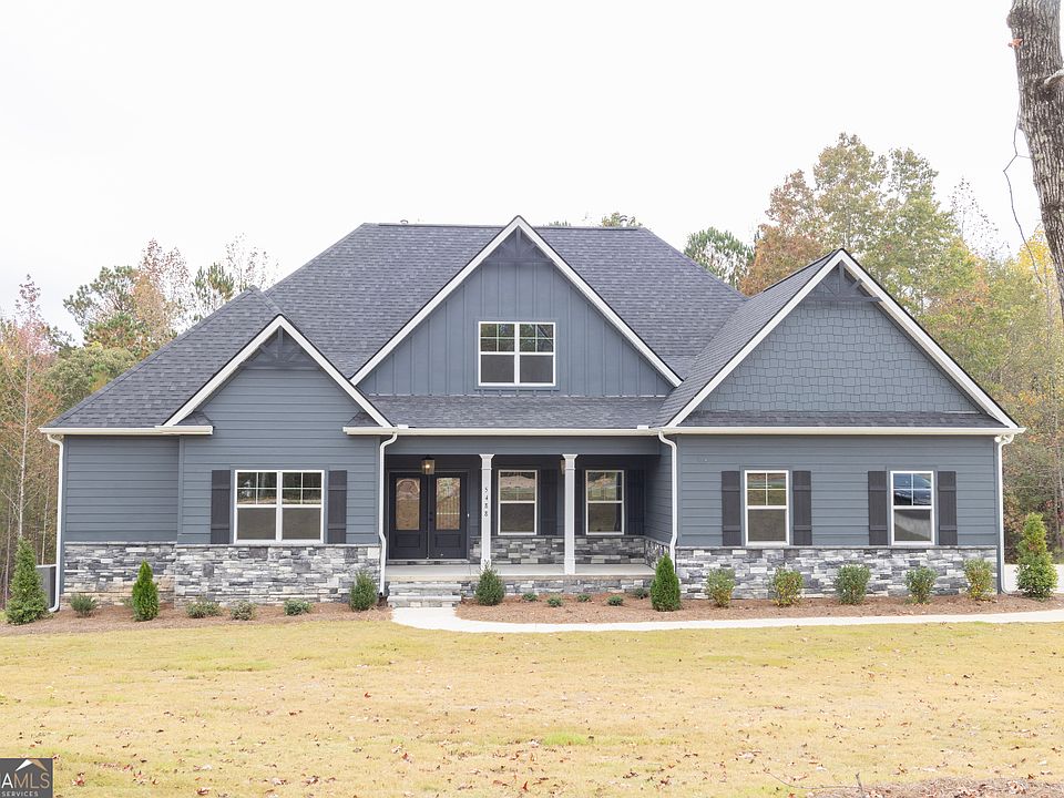 Gordon B 3557 sq. ft. - 5 bd/4 ba - BASEMENT Chattahoochee Hills - 1.5 acre lot Our standards are their Upgrades ALL INCLUDED IN PRICE, 2 fireplaces, one in family room and one on . deck columns on front rocking chair porch. 9' smooth ceilings on main level, great for entertaining, open kitchen with raised panel cabinets/knobs/ bars, tile backsplash over cooktop SS Vent hood with 2 (two) large extended kitchen islands with tons of storage and decorative hidden walk in pantry - looks like cabinets - back, granite counter tops, Upgraded stainless steel appliances, cabinet space that highlight the separate cooktop, built-in wall Double wall ovens and microwave, and a hidden walk-in chef's Pantry. The family room offers a view to the kitchen, and wood burning fireplace with stone surround. The dining room features coffered ceiling and chair rails w/shadow boxes. Owners retreat w/ sitting room & luxurious en-suite features 65 inch stand alone garden tub with decorative and sep 5 ft. tiled shower frameless shower door with header and beautiful mirror over double vanities, private water closet, huge walk-in wardrobe closet. Hardwoods on entire 1st floor excluding owner suite family room. Tile in all wet places. The 2nd floor boasts three large bedrooms each with walk-in closets and two full baths but each room has it's own sink and cabinet. Additionally there is a bonus.