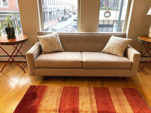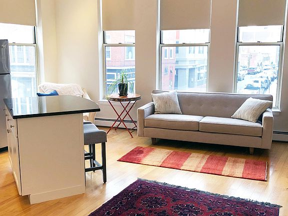 Bright one bedroom furnished apartment in the center of the Arts District. Heat and hot water included. Apartment features hardwood floors, granite countertops, high ceilings, a full bathroom with shower/tub combo, large closets, lots of cabinet space, and abundant natural light through huge windows with views of Congress Street. Coin-op laundry available. Apartment is furnished and includes custom blinds and a wall-mounted flat screen smart TV. One year lease. Parking available for extra fee. One year lease. Owner pays for heat and hot water. Tenant pays electricity, cable/internet. Pets considered on a case-by-case basis. One month security deposit required.
