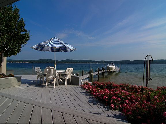 This Lake Charlevoix contemporary exemplifies the Northern Michigan Lifestyle: Soaring windows overlooking the lake, gourmet kitchen,great entertaining indoors & out, wet bar, 3 fireplaces, wine cellar, 5 bedrooms, 3.5 baths, expansive vinyl decking & an outdoor kitchen/grilling. Enjoy a midnight rendezvous at the waterside hot tub or sun bathe on your private deck off the master bedroom. Treat yourself to a spa day in the master suite. Finishing off this package is a deep water dock for a 50 foot vessel.
