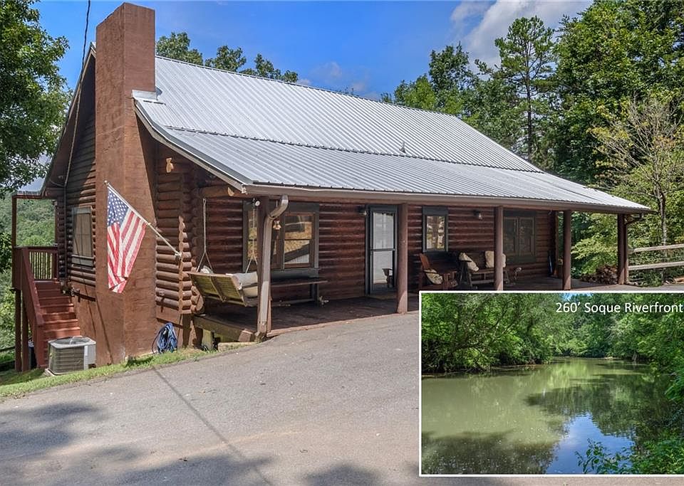 Soque Riverfront 3+BD, 4BA, 3080sqft Log Cabin on 2.5 acres. Flexibilities as short term rental, second home or permanent residence! Recently updated home has stacked stone fireplace, vaulted ceilings, exposed beams, rustic finish detail, and new roof and new LVP flooring. Kitchen has island with drink cooler and cooktop plus farmhouse sink and stainless appliances. Covered deck on main level offers mountain, river, and sunset views and is perfect for relaxing, grilling and dining al fresco. Two bedrooms on the main level, one with an en suite bath and one with hall bath. Upstairs has oversized bedroom suite with view plus tub and shower combo and extensive closet space. Terrace level is heated and cooled and has possibilities as flex living space, bunk room, and/or storage. Terrace level deck hosts expansive sun deck, hot tub, mudroom and bathroom with two shower stalls, toilet and dual vanity. With an improved path for a golf cart or ATV you'll have an easy ride or walk to the riverfront complete with a large rock outcropping perfect for lounging, fishing or launching boats. This section of the Soque River is perfect for kayaking, paddleboarding, fishing and tubing with the ability to paddle or motor up and downstream and back to your home. There are also multiple shuttle options for paddling and tubing. Outbuilding has workshop and separate living space with wood burning stove. Bonus: RV parking and hook-ups at top of drive, fenced yard for play and furry friends, and no HOA restrictions.