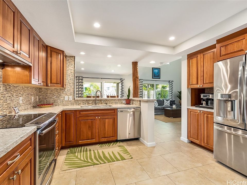This 3 bedroom 2.5 bath END UNIT enjoys a excellent location that affords privacy and lake views, and was completely remodeled in 2014 with numerous upgrades including new plumbing and electrical, vinyl double paned windows and sliding glass doors, travertine tile flooring, birch engineered hardwood floors, remodeled bathrooms, and split air conditioning in all three bedrooms. The open kitchen features a natural ohia post, cherry wood cabinets, quartz counter tops, custom stove vent and stainless steel appliances installed in 2014. The first floor with high ceilings opens out to a spacious covered lanai and a large fenced backyard with a manicured lawn and tropical foliage - perfect to enjoy Hawaii's year round outdoor living. Upstairs is the extended and reconfigured master bedroom with gorgeous views of Mt Olomana. A two car attached garage and an extra large driveway for parking for two more cars makes this home a complete package and is a must see! Kukilakila is located on Enchanted Lake and offers residents a park-like setting with lakefront paths, a pool and clubhouse, and is close to Kailua Beach, schools, shopping, and easy access to the Pali Hwy.