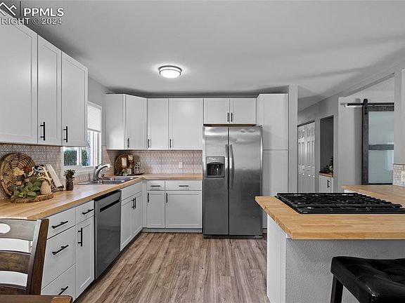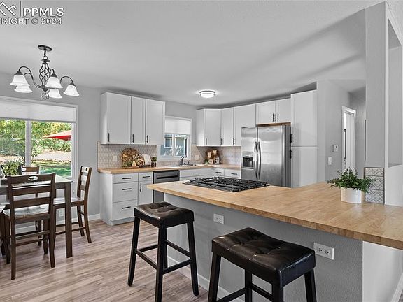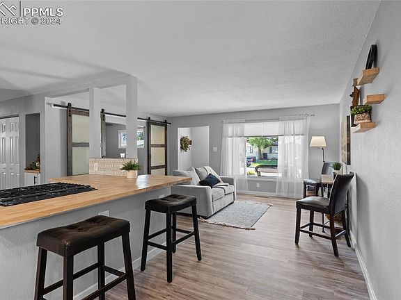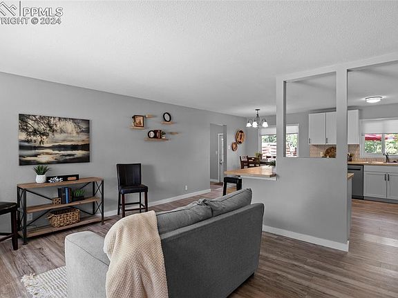 Lovely 3-bedroom, 2-bathroom fully updated rancher with expansive backyard! This home offers a spacious, inviting layout, ideal for everyday living. The living room is open to kitchen and dining and provides lots of natural light and views of Pikes Peak. A large kitchen features ample cabinetry, counter space, center island and stainless appliances. 3 bedrooms provide space and flexibility, including a primary suite with en-suite bathroom. Main level laundry. A fabulous backyard awaits you. Enjoy plenty of room for outdoor activities, gardening, or simply relaxing on the deck in your private outdoor oasis. Includes 2 storage sheds, RV parking, water and sewer service lines recently installed. Situated in a quiet, friendly neighborhood, this home offers easy access to local amenities, schools, parks, as well as military bases and the Powers Corridor. Enjoy the best of suburban living with a spacious, quarter acre lot and close-knit community feel.