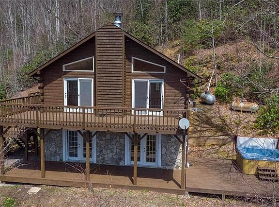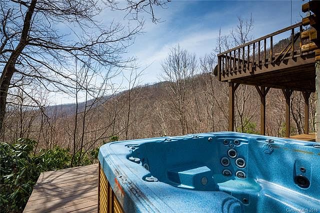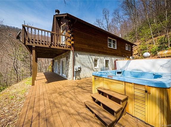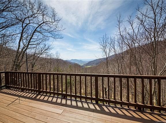 Private Mountain Home with long range mountain views. Relax to the sound of Bald Creek while enjoying the mountain views. 2,000 SF home features open floor plan, Master on Main with two full baths and another bedroom on main, large windows with plenty of light, country kitchen, beautiful fireplace with gas logs (originally wood burning); Beautiful hardwood and custom tile floors throughout. Lower floor has two large bedroom sized bonus rooms (13x14) down stairs with full Bath and kitchenette. Perfect for weekend visitors. Full width decks on both levels. Lower level has separate entrance for guests and single car garage. Private well (excellent water pressure) and septic tank: no water and sewer bills. Value, privacy and beauty close to Waynesville and Asheville.