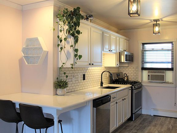 Newly renovated and centrally located two bedroom, second floor condo featuring fully remodeled kitchen with stainless steel appliances including gas stove, tri-view refrigerator, dishwasher, garbage disposal, microwave, quartz countertop with breakfast bar, and a large pantry. Living room features LifeProof flooring, open shelving, and a large picture window facing a row of arborvitaes allowing ample natural light while still keeping your privacy. Two spacious bedrooms featuring window A/C units and shiplap walls. Both rooms include wall to wall plush carpeting for added comfort, and large closets for plentiful storage. Newly remodeled bathroom featuring fiberglass tub and surround, tile flooring, newer toilet, newer vanity, and new cabinet above toilet for added storage. A linen closet sits just outside the bathroom door. Hallway features a convenient light as well as shiplap walls for added charm. Laundry facilities just 2 doors down--no need to travel to a laundromat! Minutes from downtown Westfield, Westfield State University, Stanley Park, I90, and the Berkshires! Heat and hot water included--just pay electric! Fill out an application and make your appointment today! Heat and hot water included. Renters are responsible for electricity, cable/internet, renters insurance, application fee, and to adhere to all condo association rules and regulations. No smoking, no pets.