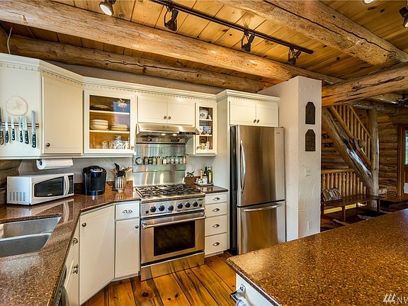 A unique hand hewn log home on 2.5 acres with a fabulous view of Campbell Lake! Open kitchen, granite counters, vaulted ceilings, gorgeous pine planked flooring. This home offers 2 bdrms and bath on main. Master w/bath and walk in closet up, including open loft area, lots of possibilities. Finished downstairs with 3/4 bath, laundry and large multiple use area for game, exercise or art. Existing apple and pear orchard. RO water system. 1728 s/f barn. View of Mt Erie right out your back door.