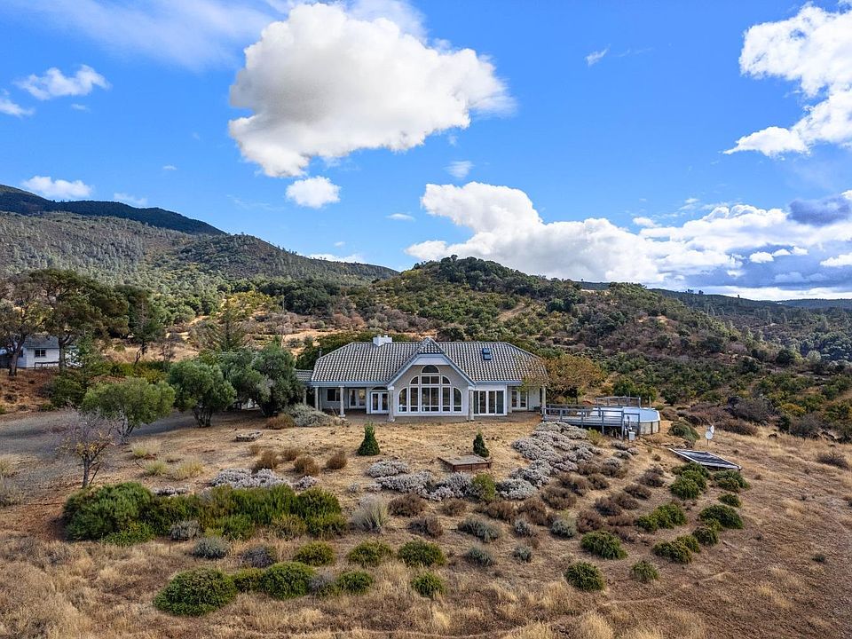 TOP OF THE WORLD VIEWS in Kelseyville! Set on a super private 38+/- ACRES, this one story Mediterranean style stucco home was designed to take in the 360 degree view over all of Kelseyville and the Lake. Featuring approx. 2200sqft., 3bed/2.5baths, open floor plan, floor to ceiling windows, large primary suite/bath, & seller OWNED solar for the water heater, radiant flooring heat and pool heat. Property includes TWO separate detached two car garages, with bonus room off on main house garage for storage (possibly gym or office area?). Second garage up from the home used as SHOP, room for parking multiple vehicles. Large metal carport also included. Concrete patio our back facing out over the incredible views of Lake County. Home sits up on the hill for the views, but there is lots of level and useable land throughout the 38 acres (zoned RL) that would be perfect for horse set up/barn/arena/gardens/vines, anything you can think of! Gated property located only about 5 mins from beautiful downtown Kelseyville for the fun local events on Main Street, local restaurants, shopping and schools. Great property, just perfect for anyone looking for some space, privacy and VIEWS that you must in person to believe!