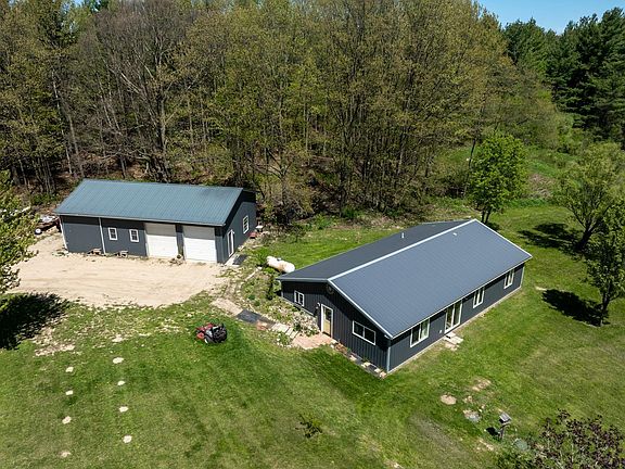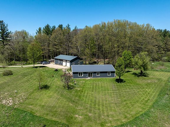 Welcome to 5490 N. Crawford Rd. This sprawling and tranquil setting with a rolling 4-acre view is situated on a quiet country road. As you walk through the entrance, you are welcomed with an open concept living style with ton of natural light. The entire home is outfitted with canned lighting and durable yet stylish rubber flooring. The custom cabinets are plentiful and do nothing but accentuate the antique enamel farm-style kitchen sink. The custom built-in storage cabinets that define your living room and kitchen/dining spaces are equipped with storage for kitchen, linens, and even a pet. Bathrooms are spacious and feature solid surface countertops. The primary bedroom and bathroom have their own private entrance/exit to the backyard. This home was only built 6 years ago, which comes with added security of your systems being in reliable condition. The options for outdoor customizing are endless. The pole barn is essential for your next rural lifestyle. Your plentiful wildlife oasis in Rosebush awaits! All measurements are estimated and should be verified by buyer.
