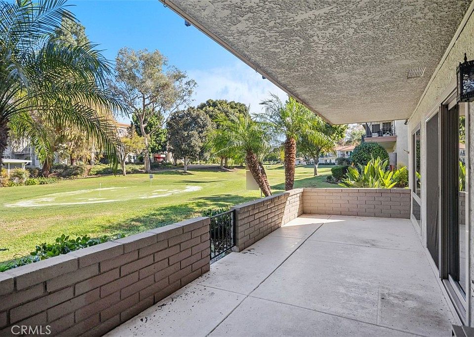 Lower end unit condo located in popular neighborhood facing a manicured putting green with beautiful view down to the serene 9 Hole, 3-Par course fairway. Convenient, easy ramp access (no stairs or elevators), within steps of your private oversized single car garage with built-in storage cabinets. Neutral walls and smooth ceilings throughout (painted in 2024), with newly installed carpet in the bedrooms and tile floors in the remaining interior space. Vertical window blinds and drapes offer privacy, while allowing ample natural light from dual pane windows facing all four compass directions! The open nature of the Casa Milano 2 floorplan (roughly 1218 sqft) allows you to enjoy the garden patio off the dining/living room, with plenty of space for your BBQ, patio furniture and to start your day watching local wildlife. In the summer afternoon there’s frequently a gentle afternoon sea breeze cooling the air. The entire northern wall of the living/dining area looks over lush green trees, grass and landscaping - all visible through large windows and a slider door to the patio. The living room also has a wood burning fireplace. Plenty of room for your table under a new bronze chandelier. The bright kitchen offers easy-care hard surface counters, white cabinetry including a large pantry with roll-out drawers, window over the sink and all new stainless steel GE appliances (installed late 2024). The counter depth refrigerator has French upper doors, a lower freezer drawer, automatic ice maker, and interior access to filtered cold water. The glass top 5-burner range offers both convection and air fryer oven features with the matching built-in microwave. Handsome new full-size Electrolux graphite front load washer and dryer tower (also installed late 2024) is centrally located for easy access between both bed and bathrooms. Bathrooms have been updated from original construction. The guest bath across from the second bedroom has a large walk-in shower with seating, stone countertop, new 19” Kohler toilet, and nickel fixtures. The ensuite master bathroom offers similar finishes, toilet, and