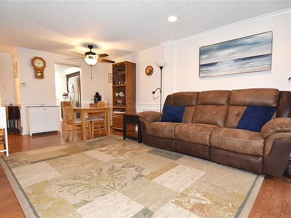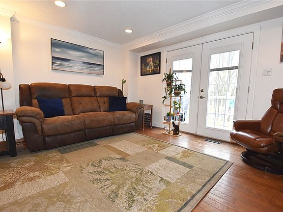 Care Free Living and move in condition! This beautiful end unit has new siding, soffit and facia, and has been freshly painted. The fully equipped kitchen has new counters, sink, backsplash, and newer stainless appliances. The open living room and dining room area has hardwood floors. French doors provide plenty of sunlight and open to the large rear deck perfect for entertaining. Two spacious bedrooms with lots of closet space. Updated full bath with new vanity and walk in shower. New ceiling fan in second bedroom and dining area. Nature stone garage floor and walk out basement into large rear yard. Convenient location close to shopping and restaurants. Just pack your bags and move right in!
