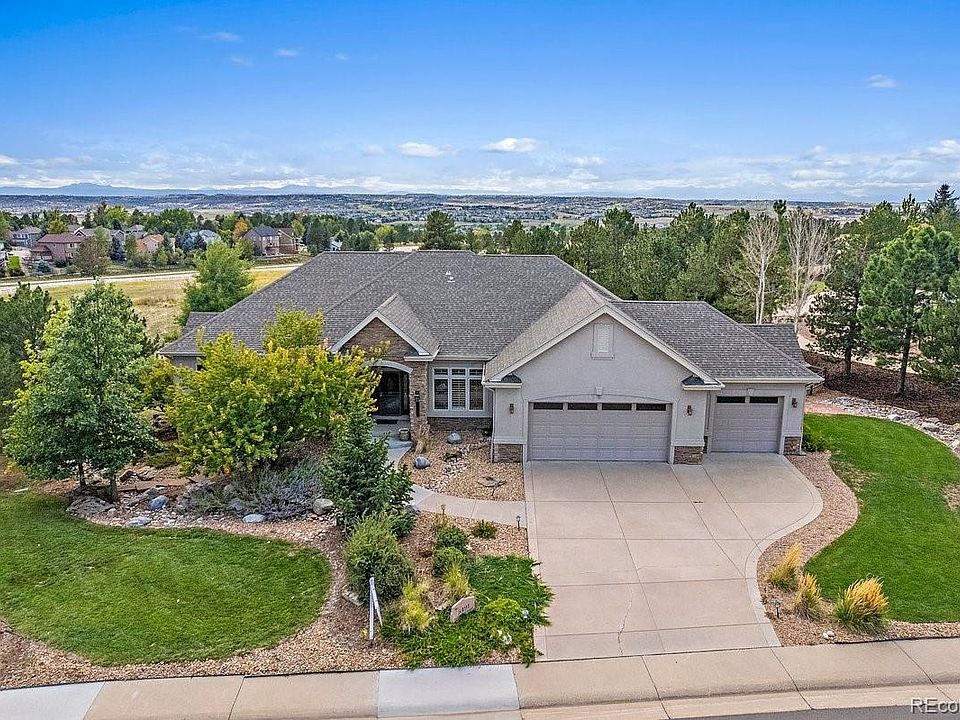 This sprawling custom ranch, built by Kurowski Development, sits on a beautifully landscaped 0.624-acre lot, backs to open space and has stellar mountain views. It is adjacent to a pocket park with play equipment for junior entertainment. The home is beautifully appointed with Brazilian Cherry flooring and cabinetry. Brand new Trex deck was just replaced in 3/2022.The kitchen features high end appliances, granite counters, an eat in nook, and a well-designed butler's pantry with tons of storage and a sink. The walk-in pantry features lots of storage plus a cook's desk from which to plan your entertaining adventures. The primary suite is inviting with a private deck, vaulted ceiling, large windows with mountain views. The ensuite features 2 sinks, a jetted tub, and separate shower. The closet is large with built-ins. The walk out basement provides 3 additional bedrooms, an exercise room, another family room, a theater specially designed to appease the audiophile with curved ceilings and walls and serious sound proofing. A temperature-controlled wine room with custom wine and champagne storage will satisfy the serious collector. The 3-car garage includes a work bench and cabinetry for storage. Call me for a private showing!