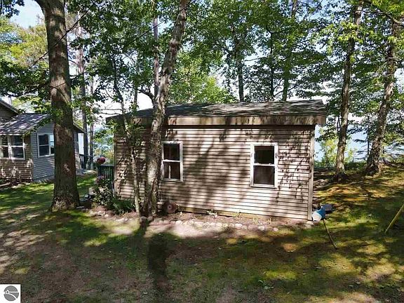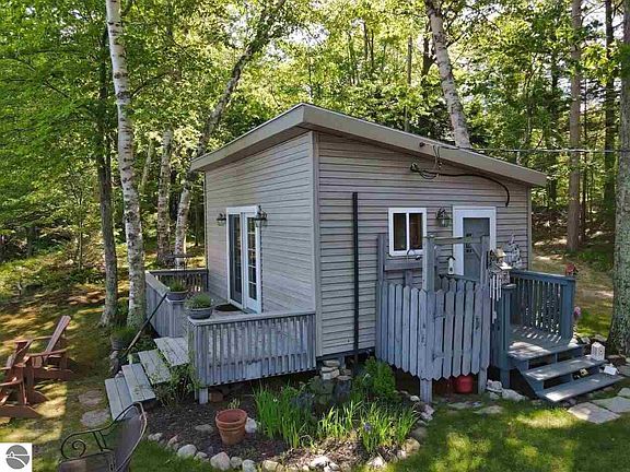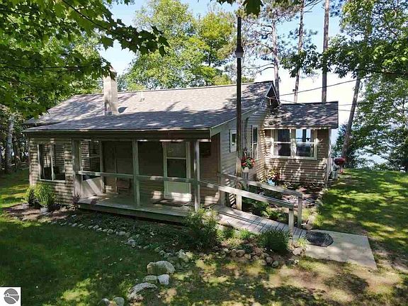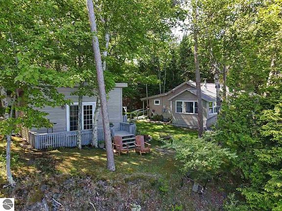 With 200 ft of private, secluded frontage on LAKE MICHIGAN, this charming cottage and guest cottage offer one of the most private locations you'll find on Lake Michigan. Hidden, wooded setting on a scenic paved road and under 40 steps down to the sandy beach. Large windows provide for stunning views from inside this inviting home and bunk house, perfect for families and friends, with space for everyone. The main living area of the house features an open floor plan with a combined dining/living area which leads out to the deck where there is plenty of room for sunbathing and sunset watching. The wood-burning stove adds comfort off-season. The master BR, remodeled master BA, and one BR each have incredible views of LK MI. The fire pit and outside shower for even more fun and star-gazing!