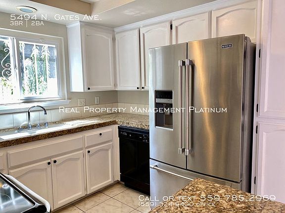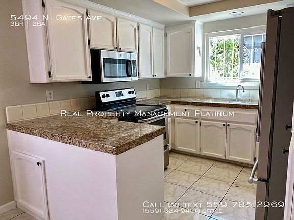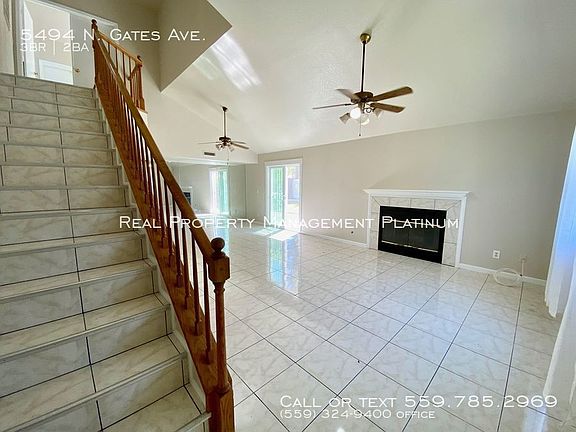 This 3 bedroom 2 bathroom home has 1456 sq. ft. and was built in 1990. Two story home set back with a deep driveway. New paint. Tile floors throughout. Spacious great room has a gas fireplace, full mirror wall, ceiling fans. Kitchen has granite counters, stainless refrigerator, electric stove/oven, microwave, dishwasher and dinette area. Master is upstairs with dual vanities, shower, double closets. Two additional bedrooms downstairs. Guest bathroom has single vanity and tub/shower. Laundry has electric hook ups and leads to the attached 2 car garage. Yard care is provided. Alarm available at tenant cost if wanted. Non smoking. No pets. No more than two unrelated adults. Renter's insurance is required. Cross streets are Fig Garden & Gates. DRE# 01901101. All information is deemed reliable but not guaranteed and is subject to change. Status: Active