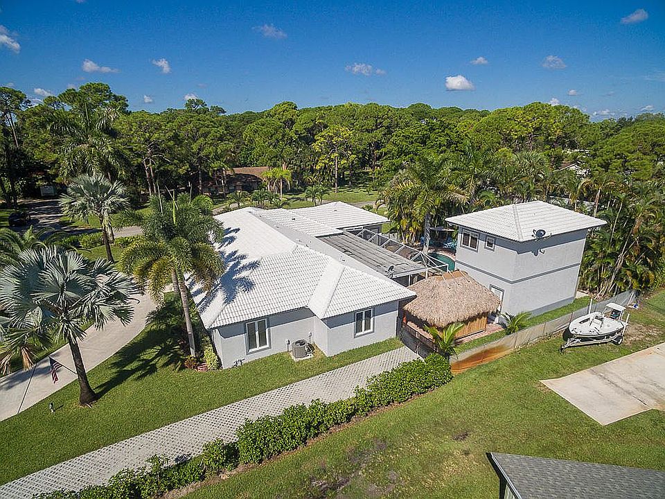 Gorgeous 3 bedroom 3 bath home with 2 story guest house located in the desirable Jupiter community of Pennock Point. Quality construction by this builder/owner. Kitchen boasts newer stainless steel appliances, granite countertops, cooks island & 42 inch cabinets. Off of the kitchen you have a large formal dining room and nicely appointed living room with a built in entertainment center. Large sliders off of the living room which lead to the covered spacious lanai with pool table, seating, TV and a lovely water fall. Step outside of your Lani and relax by the salt water pool or have a seat and watch your favorite team at your private Tiki Bar. Guest house is complete w/ 1 bed 1 bath, Living Room and a full kitchen w/granite counters & SS appliances. 2 newer AC units and hot water heater