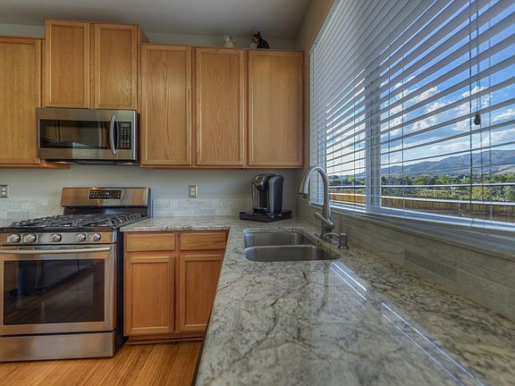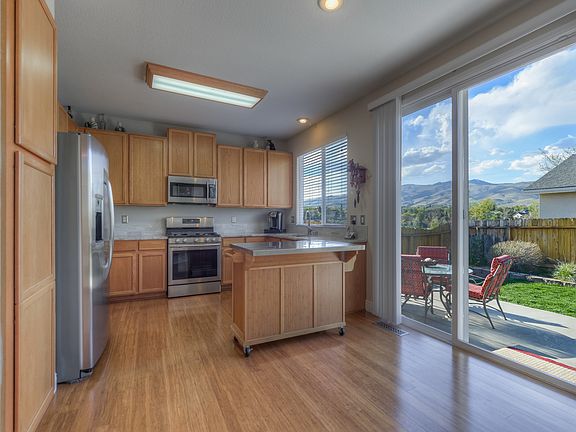 Location. In a Cul-de-sac, by a park and views for miles. Each day you can take in the amazing Sierra sunsets from your spa, porch, patio, and living room. The kitchen has stainless steel appliances, granite counters and a movable center island. The driveway is oversized and has space for plenty of vehicles.