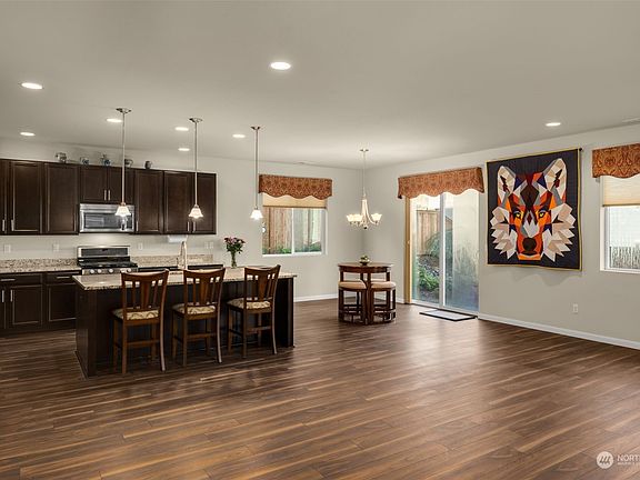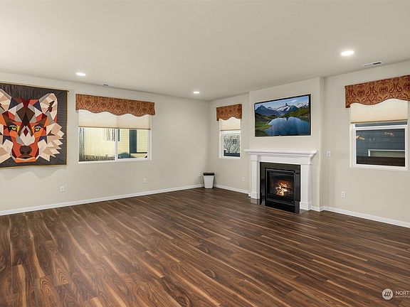 Skagit Highlands Two-Story. Great room style floorplan. Living room with cozy gas fireplace is open to dining area and big kitchen with island, slab granite countertops & stainless appliances. Walk-in pantry. Mudroom with bench & cute storage shelves off garage. Versatile room at the top of stairs could be used as a family room, playroom, den, or add walls to create a 4th bedroom. King-size primary suite with walk-in closet & 5 piece bath. 2 additional bedrooms & full bath up. Laundry with large counter conveniently located upstairs. Home has tons of storage. Easy maintenance, fully fenced back yard with pavers & propane firepit. View of Mt. Baker from backyard, family room & primary bedroom. 7 parks & miles of trails. Close to Hwy 9 & I-5