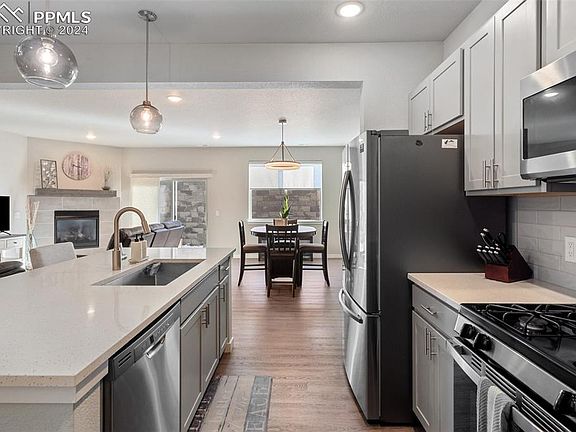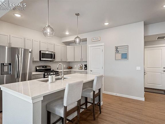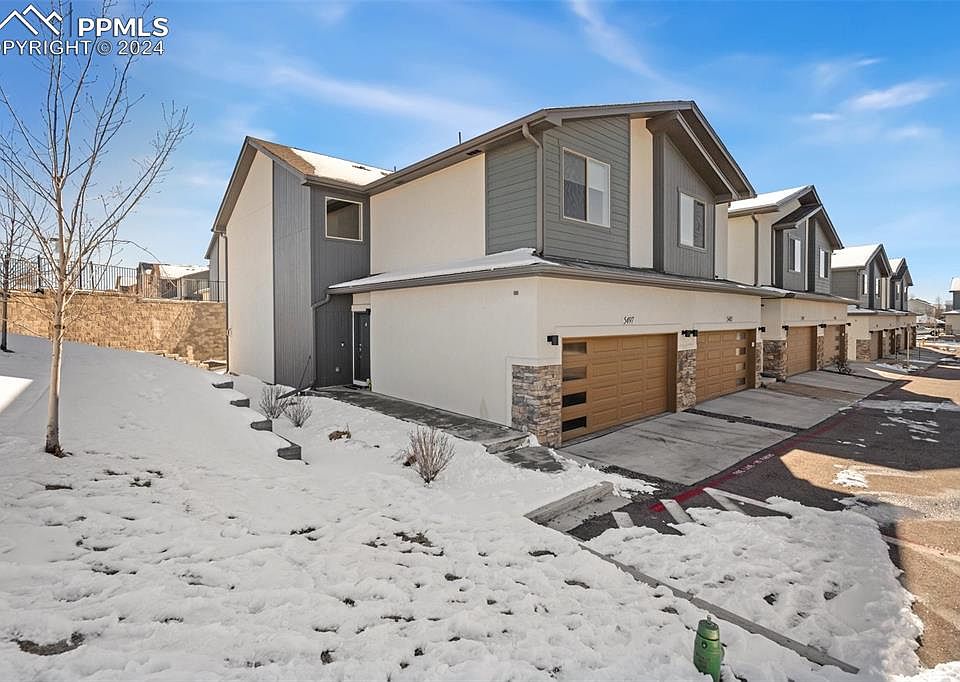 This amazing end unit townhome is a wonderful place to call home ~ Mountain views ~ Three bedrooms, three bathrooms and a spacious 2 car attached garage ~ This beautiful property will make you feel all the comforts and warmth of home itself ~ Can also be a great "lock and leave" property for a mobile work life ~ The attached garage is insulated & sheet rocked ~ The home is light, bright and welcoming ~ Central A/C, whole-house humidifier, gas-log fireplace, ceiling fans throughout, whole house ventilation system ~ Bright/white quartz counter-tops and stainless steel appliances and amazing Pikes Peak and mountain views from the upper level are only a few of the beautiful features this home ~ High-end window coverings ~ Close to nearly everything; shopping centers, restaurants, military installations, this home is also just a short distance of the local schools ~ You will love gathering and creating meals in the beautiful and open kitchen with the high-end features such as quartz counter-tops and stainless steel appliances ~ This elegant and warm home has been gently lived in and is still very much like new ~ Did I mention mountain views ~ Call your favorite real estate professional and see it today