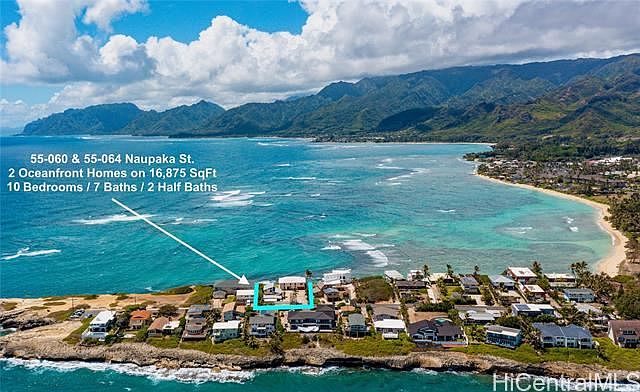 2 OCEANFRONT HOMES with stunning panoramic ocean views of Laie Bay and breath-taking Ko'olau mountain views. Both homes are two stories, include a combined 10 bedrooms, 7 bathrooms, and 2 half baths, and are adjacent to each other in a gated and walled 16,875 sq ft of land. 55-060 Naupaka Street has 4 bedrooms and 3 bathrooms, and 55-064 Naupaka Street includes 6 bedrooms, 4 bathrooms, and 2 half baths. Deeded beach access just steps from the houses. Both homes have their own separate individual Tax Map Keys (TMK's). Rare opportunity to own two adjacent oceanfront homes on the beautiful and serene Laie Point. Very close to BYU, the Polynesian Cultural Center, North Shore beaches, Waiomea Bay, Pipeline, and the 5-Star Turtle Bay Resort, featuring farm-to-table restaurants, world class golf, oceanfront horseback riding, walking trails, and helicopter tours. Approximately an hour drive to Honolulu by car or 15 minutes from HNL to Turtle Bay's Heliport. Easy to view on short notice. Welcome home to paradise!