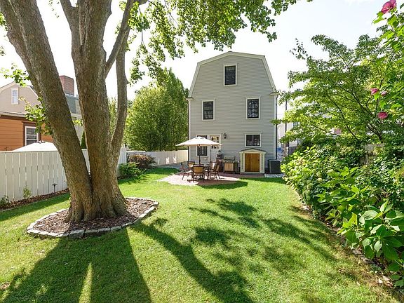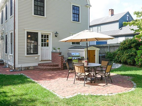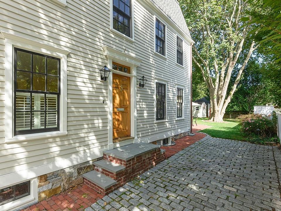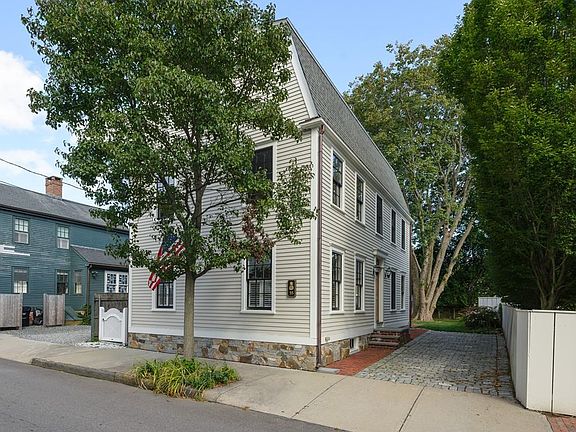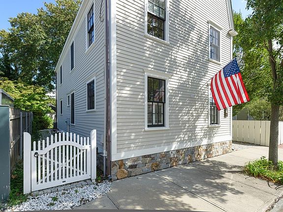 This lovely gambrel Colonial reproduction is situated in the Historic Point neighborhood of Newport within an easy walk to the harbor, fine restaurants and shops. Built new in 2006, this pristine residence offers three bedrooms, two-and-a-half baths, central AC, gas fireplace, crown molding, and wainscoting. The property is further enhanced with a cobblestone driveway, brick patio, private fenced yard, colorful gardens, and storage shed. Move-in ready and no flood insurance required.