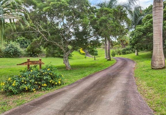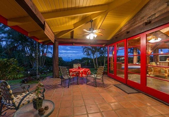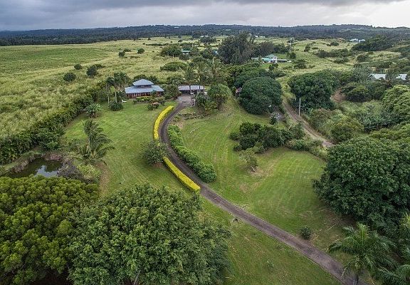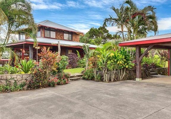 You are viewing a beautiful private compound with several buildings, ocean and Maui views, and a park-like setting. The main house features reclaimed beams constructed with peg and mortise joinery. Much of the Douglas fir is from the old Willamette Paper Mill and the posts in the kitchen are from an old railway bridge - spikes included. All interior doors are custom made from bamboo and reclaimed redwood. The kitchen cabinets and stairs are also custom made from Kona reclaimed redwood. The floors are a combination of stained and tooled concrete in the entry and main living areas. There is bamboo flooring in the kitchen and hallway. The first floor bedrooms and den have carpet. The upstairs bedroom has Douglas fir. The entire second floor is the master bedroom which features a special bathroom with soaking tub and outstanding ocean views. Several rooms have built-in furniture such as window seats with storage in the living room and a six-drawer built-in chest in the master bedroom. A spacious carport boasts an attached office. A large covered lanai at the entry features Saltillo tile flooring and a ceiling fan. It is the perfect place for pau hana to socialize or view the colorful garden and bird watch. A large pond with ample deck is for relaxing and Tilapia fishing. A hand-built pergola hale between the main building and carport adjoins a stone backed fire pit. The property has a mature fruiting citrus orchard, coconut palms, mango trees, lychee, starfruit, nutmeg, coffee, bamboo and numerous flowering tropical plants such as gardenias, hibiscus, plumerias, royal poincianas and bromeliads to name a few. A dense tall palm hedge borders the east for wind protection and privacy. This property is meticulously maintained. A one bedroom guesthouse has a separate gate and driveway. There are additional buildings for storage and a special copper-roofed building with a large covered lanai. These buildings are in the process to get permitted.