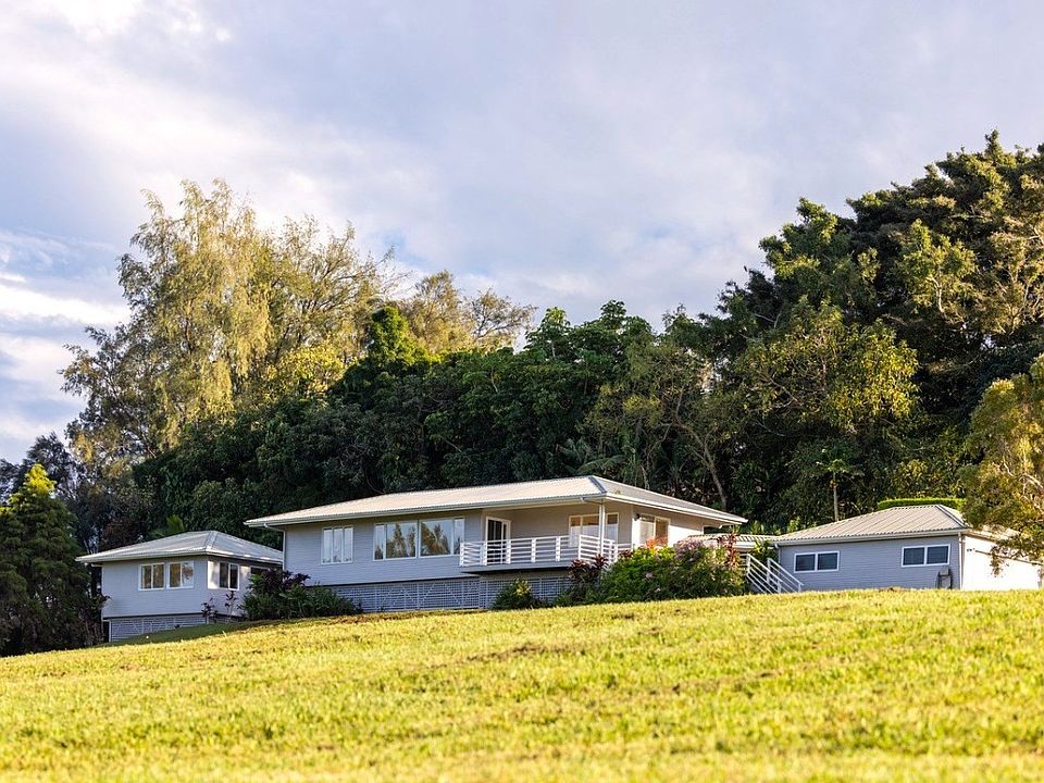 Cozy private residence on 3 acres with amazing Maui views located in desirable Kaauhuhu. The main home features 2 bedrooms, each with its own ensuite bathroom, wood floors throughout, high ceilings, an open floor concept, large casement windows, and a detached garage. The original finishes present an incredible opportunity for you to personalize and make it your own. The home is set at the top of the southeast boundary so whether you're having coffee on the front lanai or tranquil backyard, you'll feel as though you're on top of the world. In addition, there is a private detached studio ensuite perfect for an office, art studio, or guest quarters.