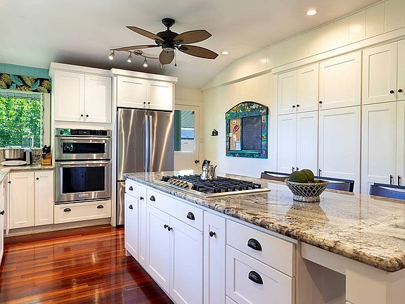 Built in 1960, this plantation style home has been seriously remodeled, updated and enlarged with a primary bedroom suite added. The new kitchen with granite counter tops, a gas cooktop, built in electric oven and microwave and a large island offers plenty of space for family and friends and easy access to the open dining area and spacious screened back lanai with an ocean view. The new primary bedroom includes a large dressing area, unique corner shower and lots of closet space. Two small bedrooms have been converted to a much larger guest suite or office space with its own updated bathroom right next door. A fully permitted garage and storage area with a possible studio or art or hobby space adds to the potential of this property. Mature macadamia nut trees, mango, grapefruit, pomelo, jaboticaba, sapodilla, mountain apple, avocado, surman cherry, lychee, dragon fruit, papaya, cacao and several ohia trees all add to the unique bounty of this property. With over three acres, there is plenty of room to expand the gardens, add a swing set or just enjoy the peace and privacy.