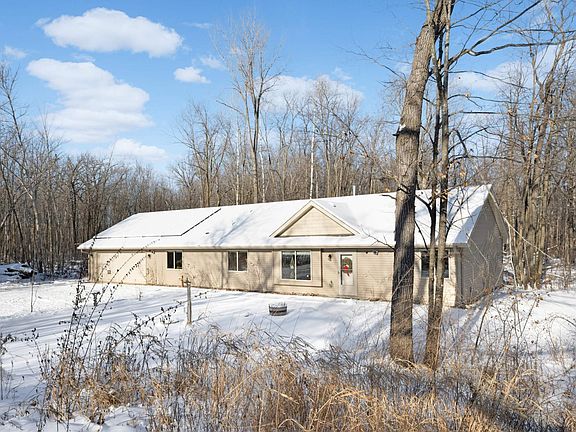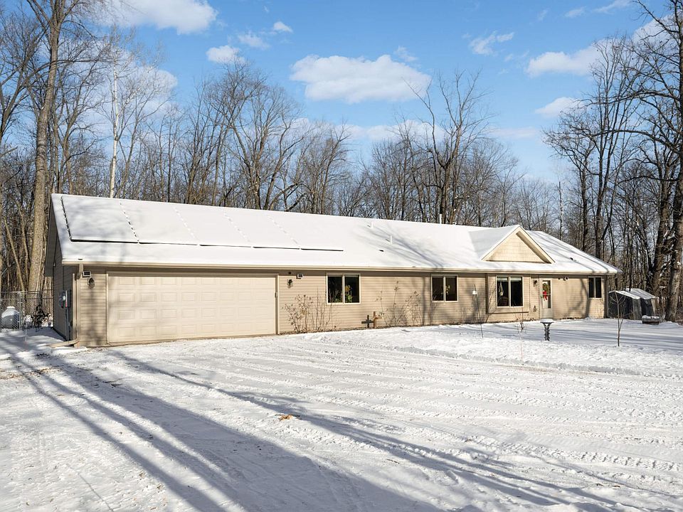 Welcome to this 2016 custom built home that sits on a sprawling 5-acres of wooded land. Its ranch-style offers one-level living at its finest at the end of a cul-de-sac. Large attached oversized 2-car garage that's well over 700 sqft. The seller installed brand new solar system that allows you to erase your energy bill during part of the year. Home equipped with highspeed fiber optic internet. Open concept living area that's perfect for entertaining for the holidays. The airy living area is completed with vaulted ceilings, double-sided fireplace and custom cabinets in the kitchen. Mudroom with laundry off the garage. Two full baths. Large walk-in closet in the master bedroom with double sink in private master bath. Gorgeous, wooded acreage in the back perfect for watching wildlife with your morning coffee.