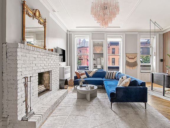 Situated on the third floor of a truly unique 1880’s Gothic Revival limestone townhouse, this generously sized one bedroom has approximately 900 square feet of living space and can easily be reconfigured to accommodate a second bedroom, office or den. Light floods in through three enormous front windows in the living room, which look out on a charming balcony, spanning all three windows, and the Brooklyn Conservatory of Music. The centerpiece of the grand living room is the gorgeous wood burning fireplace complete with pier mirror and is illuminated by the petal pink venetian chandelier above.