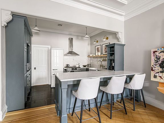 The brand new stunning kitchen was just completed and is sure to charm you. Highlights include the painted custom millwork, White Attica Caesarstone counters and backsplash, the retro fridge and the stainless suite of chef's appliances. The white farmhouse sink is large enough to hide any mess and the brass fixtures and sconces above are the perfectly accent.