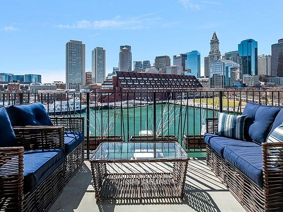 Fully Renovated North End/Waterfront 2-bedroom, 3-bath Penthouse with water views from every room, 2 private balconies and marina outside your door. This Historic Commercial Wharf waterfront 2-level penthouse residence offers unmatched views of Boston Harbor, Christopher Columbus Park and the Boston Skyline. Rarely available unit and a half home showcases nearly 2,300 square feet of brick and beam living space, soaring cathedral ceilings, open floor-plan, en-suite master bedroom loft with walk-in closet, large en-suite guest room, new gourmet kitchen: Wolf/Subzero appliances, custom cabinetry, lava stone counters, entertaining size island, gas grill on new balcony, ample storage, and parking for family and guests. The living room boasts soaring ceilings, stone gas fireplace, wine cabinet, folding glass wall that extends your living space onto your private south facing 90-square foot, blue stone terrace with dramatic panoramic views of Boston Harbor and the city skyline.