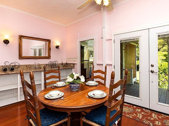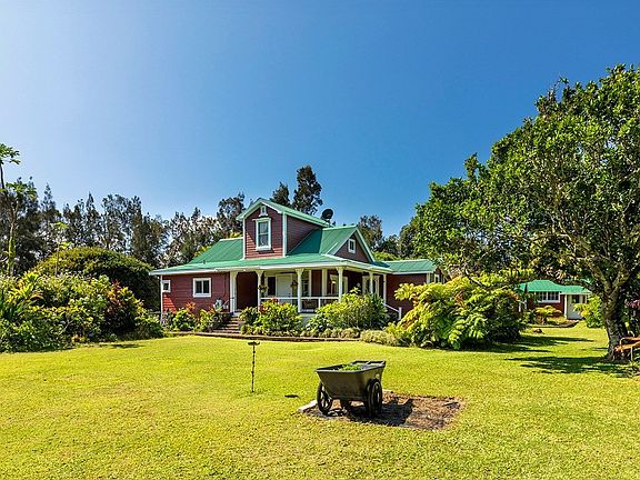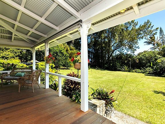 This original, carefully renovated plantation-era home on Beers Road in North Kohala is said to have been built in 1922 for Eleanor Beers, for whom the road is named. Situated on almost two private acres with mature trees and gardens, the feeling is country, although the shops, boutiques, restaurants and services in historic Hawi town are only a few miles away.Two doors off the covered wrap-around porch open to the central hallway and dining room. The kitchen has been updated with Wolf stove, Bosch dishwasher, LG refrigerator, trash compactor, granite countertops, and wood flooring. The built-in buffet in the dining room now features a granite counter as well.A high-ceilinged great room with a stone fireplace and built-in window seat looks out into the gardens. The master suite is located off the central hallway on the other side of the stairway to the second floor. The current owners converted a small "nursery" room attached to the master bedroom into a new bathroom and powder room, and turned the small previous bath into a walk in closet, as homes of the era relied on wardrobes and chests rather than modern-style closets. The downstairs guest room has new Ipe flooring and a remodeled bath. A second guest room is upstairs.Other recent upgrades include solar electric, gas on-demand water heaters, and a heat pump to provide heating/cooling to the great room and master bedroom.As is typical of the era, a separate structure at the rear of the home contains the laundry facilities and another bath for you to shower after gardening. The barn is currently used for storage but could be a garage. The gardens have two gazebos, patio paver walk ways, and numerous fruit and flower plantings. Enjoy orange, lime, clementine, pomegranite, avocado, banana, papaya, pineapple, lychee and coffee from your trees. Exotic flowers like jade plant and orchids add to the tropical ambiance.