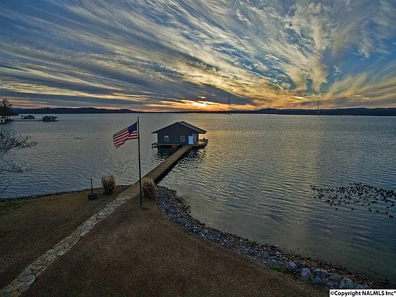 Custom Built Main Channel Waterfront Home on Lake Guntersville. This spectacular property features 1.95 Acre level lot, 220+/-ft of shoreline, 2 Slip Boat House with electric hoists, roll-up doors, bar area, & great water! 3 Bedroom / 2.5 bath home offers 2,250+/-sqft, hardwood floors, crown molding, greatroom with real wood burning fireplace, kitchen with granite counter tops, kitchen-aid stainless appliances, Master suite with double walk-in closets, bath with separate vanities, & tile shower, lakeside back porch with vaulted wood ceiling, stone wood burning fireplace, outside cooking porch with grill, sink,& concrete counters, tankless water heater, central vac, + more!!