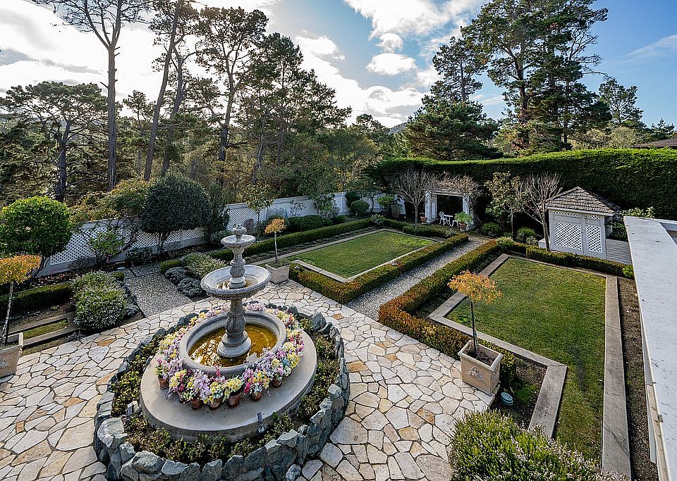 Just under 3500 s.f. - this home is a single story custom ranch home in the most prestigious neighborhood in Monterey! Sequestered behind the mall in complete privacy, this 27,000 s.f. lot offers complete privacy. The home is all one story, except the studio downstairs accessible from the home's interior and also from the exterior. Lush english gardens surrounded by trees with a featured fountain show off the great entertainment areas. Wrap around balconies with tile overlook the english gardens. Four spacious bedrooms and two full bathrooms are included on one wing with the living room, family room, kitchen, dining room, and formal dining room on the other wing. Downstairs includes the garage and the additional studio with 1/2 bathroom and full kitchen with sink. This home is filled with water credits. This is fabulous for an extra large family and/or multi-generational family situation with the downstairs offering an additional unit or fifth bedroom. This home was meticulously maintained and the studio unit was used exclusively for large family dinners and events.