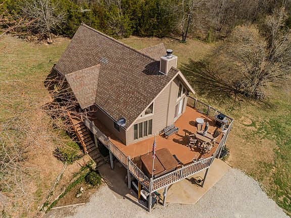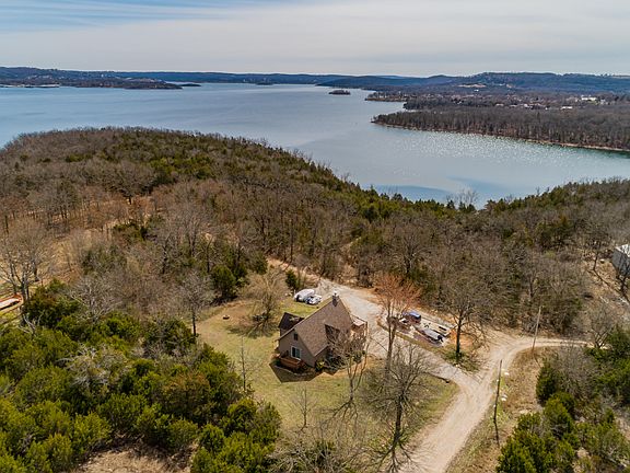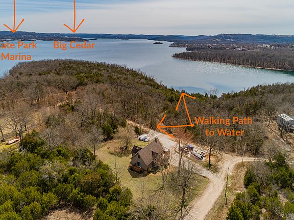 Almost lake front home on a budget! This quintessential Blue Eye lake home is the perfect way to obtain that laid back Table Rock Lake lifestyle at a price you can afford. Located just across the main channel from Big Cedar Lodge, this A-Frame home boasts a beautiful lake view, a spacious, updated living room with vaulted ceilings, a large contemporary ceiling fan, custom-built steel handrail, and a wood burning stone fireplace with a distressed timber mantle. The kitchen and dining room are ready for you to entertain with upgraded black stainless appliances that come with the property and the refrigerator has two ice makers! The main floor master has its own private deck for your morning coffee and main floor laundry. The large bedroom on the 2nd level would make a great spot for your family or guests and the lower level offers a 3rd bedroom that would be a great bunk room! The 1.5-car garage features ample storage and you'll also have covered parking for two vehicles under the massive deck. Want to know the best part? This comes with a 2002 20' Starcraft Stardeck Aurora (Deck Boat) and Trailer. The closest boat launch is just about a mile down the road and 3rd party slips are readily available. The water is close using an easily walkable path through the trees and leads to a beautiful, quiet cove with shelves of rock. It's like your private Ozark beach! This property won't last long, so call today to schedule your private tour!