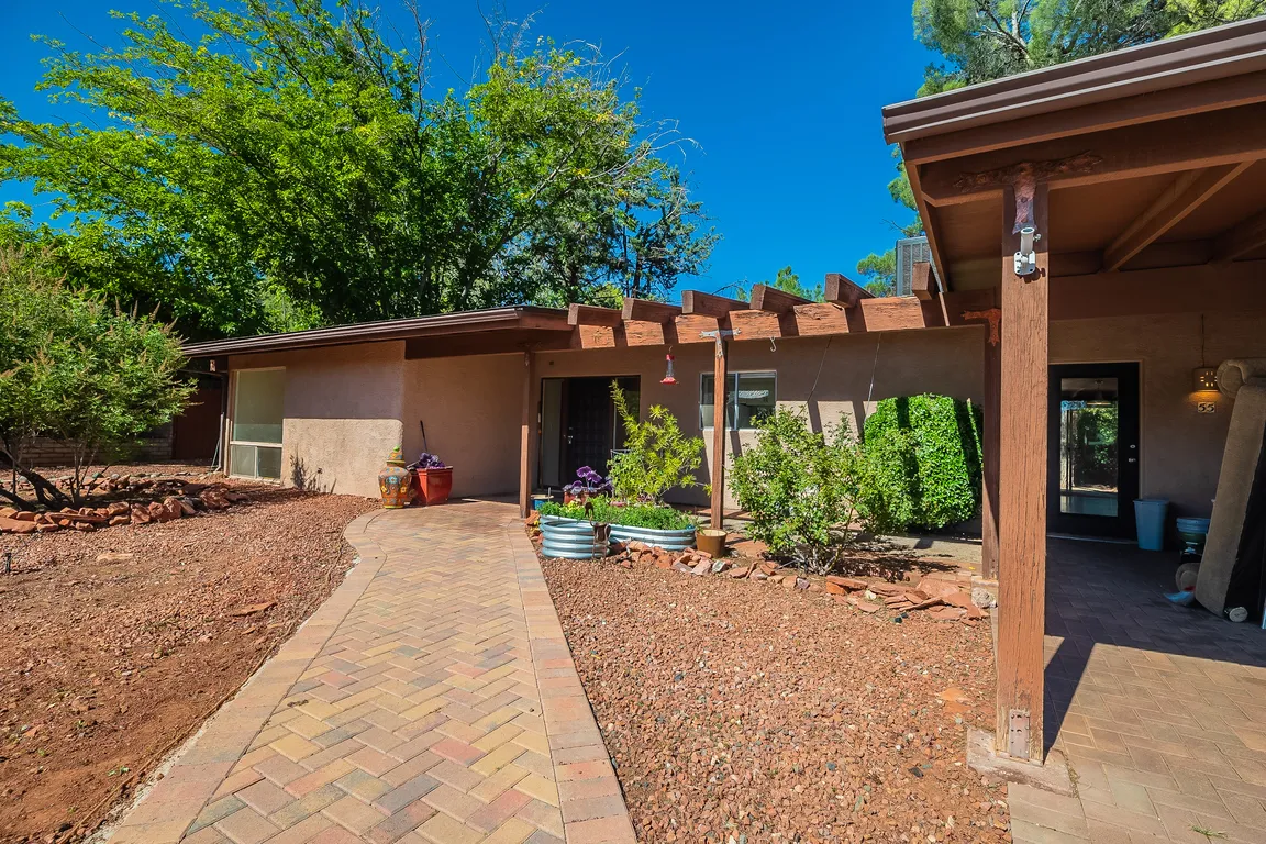 Fenced backyardPaver drivewayMature treesFlowering bushesDramatic wall of glassPeaceful retreatRed rock views