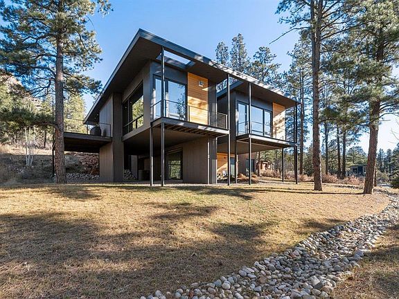Discover this stunning contemporary home in Durango’s renowned Twin Buttes community, where a modern, minimalist aesthetic enhanced by ample storage artfully complements the beauty of the Colorado landscape. Thoughtfully crafted with an open-concept layout and walls of windows framing the towering ponderosa pines, the result is a home that feels as if it’s perched among the treetops. This elevated, treehouse-like ambiance is perfect for everyday comfort and effortless entertaining. Sleek quartz countertops, premium Bosch appliances, and generous storage make the kitchen a culinary haven, while a large island encourages casual gatherings and conversation. Engineered hardwood floors throughout lend warmth and durability, and central air conditioning ensures year-round comfort. In the living area, a gas fireplace provides ambiance and a focal point, completing a home that truly embraces the natural environment while exuding modern luxury. The main-level primary bedroom is a private retreat with direct deck access, an ideal spot for morning coffee amid scenic views. Downstairs, the second bedroom features a full ensuite bath with dual sinks and a covered deck, making it a perfect haven for guests. Thoughtful details continue throughout, from tinted windows that enhance energy efficiency and privacy to an interior whole-house fire suppression system that offers peace of mind, and generous storage areas that keep the home clutter-free. A flexible workout room and crafts space adapts to your changing needs, and a two-car attached garage provides secure parking and additional storage. From the dining room step onto a spacious deck equipped with a natural gas connection ready for your grill and a great view of the Twin Buttes, perfect for entertaining under starry skies. Twin Buttes encourages an active, nature-oriented lifestyle, offering amenities like a pickleball court, hiking and biking trails, open spaces, and community gardens. When you crave a touch of city energy, downtown Durango’s dining, shopping, and cultural attractions are only minutes away. Combining contemporary style, high-end finishes, and an exceptional location, this home ensures you’ll enjoy comfort, luxury, and harmony in Colorado’s remarkable environment. Don’t miss the opportunity to make it your own.