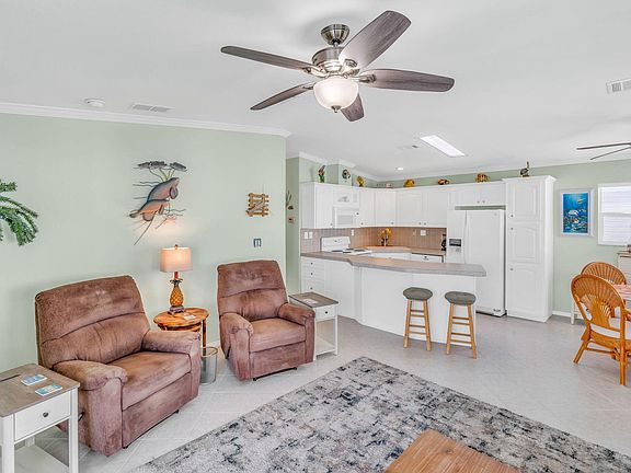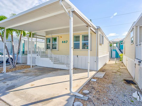 Welcome to Seaside Resort, a gated, waterfront community just 10 minutes from the heart of Key West! This bright, cheerful 2 bed, 2 bath home with 864 sq ft of updated living space is move-in ready and offered turn-key furnished. Step inside this impeccably kept home to discover an open-concept layout filled with natural light, coastal charm, and a spacious feel. The kitchen features crisp white cabinetry and a breakfast bar that flows seamlessly into the dining and living areas creating a perfect setting for entertaining. Vaulted ceilings, tile flooring, and a neutral color palette add to the inviting atmosphere. Outside, enjoy 2 covered parking spaces and a 2,040 sq ft land owned lot, a rare and valuable perk in resort-style living.Located in the sought-after Seaside Resort, residents enjoy outstanding amenities including 2 pools (one waterfront!), a full marina with boat ramp, fitness center, bocce ball, clubhouse, trailer/boat storage, and a calendar full of social events like happy hours, live music nights, poker nights, and book clubs. Ideal for full-time residents or seasonal snowbirds looking for a vibrant and peaceful coastal lifestyle.