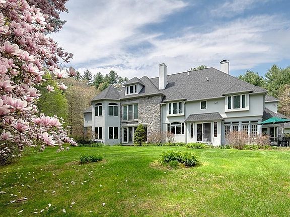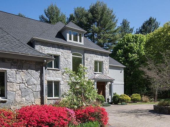 Handsome 5 BR stone front Country Estate on 5 secluded acres in desirable neighborhood embraces gardens & sweeping lawns, reached by private tree-lined drive. Fine craftsmanship, design & luxury for gracious living/entertaining in this meticulously maintained home, loved over the years. Sunny main level offers exceptional flow w/tall ceilings & large windows. Delight your guests in elegant formal LR w/fireplace, DR w/tray ceiling plus remarkable mahogany library makes for premier work-from-home space! Sunny updated kitchen w/grand fireplace opens to adjoining family room creating a wonderful gathering space. 2nd level offers luxurious master suite w/sitting area room & luxury bath, 4 add'l BRs w/ensuite baths & bonus room. Summer BBQs will linger into evening on the patio & 3-season porch overlooking tennis court & large backyard that nature lovers will cherish in all the New England seasons. Priced below replacement cost makes this a perfect home just 2 miles from town Center.
