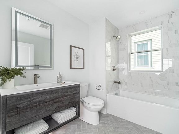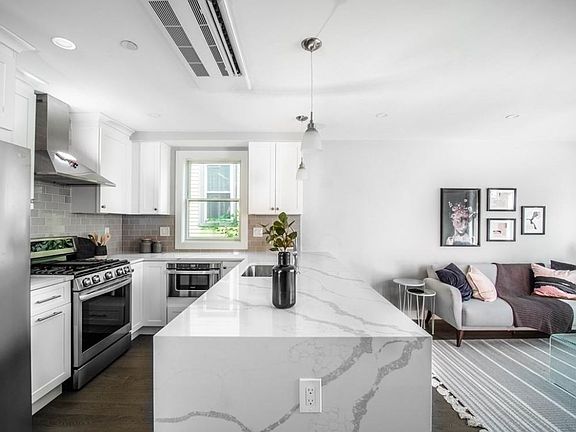 This absolutely stunning first floor unit boasts a spacious open layout, hardwood floors, high ceilings, in unit laundry, central a/c, extra storage and decorative lighting. The stunning kitchen area has beautiful quartz counter tops, modern white cabinets, glass tile back splash, breakfast bar with seating and is fully equipped with stainless steel appliances including a gas range, dishwasher, and built in microwave. The living space is bright and spacious and can accommodate most furniture. Additionally, both bedrooms are a good size with big windows and closets. Gorgeous full bath with modern fixtures. Pets negotiable 1 off street parking spot Located just a 15 min walk from Wood Island T stop and close to many shops, markets,restaurants, parks and more Available 10/ 1 Water/Sewer included Pets negotiable First, Last, Security, Broker fee