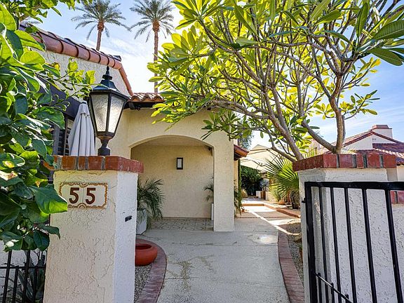 The home is truly a dream come true. The floor plan has been reimagined, and pictures cannot do it justice. Casas de Seville is a small Mediterranean-style enclave comprising 72 homes surrounded by beautiful landscaping and ample green grass. It is one of the most desirable and sought-after intimate communities In Rancho Mirage. 55 Calle Regina is a three-bedroom, three-bath ensuite home with excellent curb appeal, nestled in a private cul-de-sac and close to a newly remodeled pool and spa. Entering the home's front gate, you realize something magical in the landscape design, from the Brazilian teak accent wall to the multiple fountains and desert scape. Opening the New custom front doors, one sees a lovely space where the kitchen, with its stainless-steel appliances, quartz counters, new custom cabinets, and elevated dining area, flows effortlessly into the living room. An atrium helps boost the natural light in the home. The three bedrooms all boast custom tile baths, with one featuring a Zen Garden with a'' Wall of Water.' The laundry has a separate, enlarged room with a new new LG Wash Center, washer and dryer. The garage has epoxy floors and a newly added attic and exhaust fans. Ceramic tile runs through the entire home; all windows have custom shades. The complex has four pools and two tennis courts. The house is a must-see...one of a kind in a great community.Please see the Documents for all improvements.