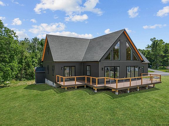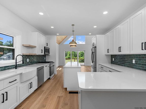 BRAND NEW CONSTRUCTION! Experience all that Hudson Valley living has to offer in this custom built, modern, chalet home. Here’s your chance to be the first to enjoy a unique, contemporary home, just minutes from the thriving Uptown Stockade District and Wiltwyck Country Club. Situated on 1.94 acres, the property offers a perfect blend of modern living, custom finishes, and amazing year round Catskill Mountain views with picturesque sunrises and sunsets. The home features three spacious bedrooms and three full bathrooms with an open layout , making it the perfect setup for entertaining guests and hosting family gatherings. Main level boasts 24-foot ceilings with engineered hardwood flooring and large picture windows with bright natural sunlight throughout. Fully equipped kitchen has all brand-new stainless-steel appliances, custom cabinets, quartz countertops, breakfast bar top seating, an island with a dual temperature wine cooler and a farmhouse sink. Primary bedroom suite includes a walk-in closet with a sleek modern bathroom featuring a double trough sink floating vanity, his/her walk-in showers, luxury soaking tub and floating wall mounted toilet. Walk out access off the primary bathroom leads you to the wrap around deck and a lovely built in cargo net with an outdoor fireplace to relax and enjoy nature. Two bedrooms, full bathroom and a washer/dryer complete the first floor which make for convenience and easy living. As you go up the second level you are greeted by a double custom bookshelf and loft space overlooking the main level. There are two additional bonus rooms which provide ample space for an at home office/extra guest room along with a full bathroom and wall of closet space across the hall. Lower level is unfinished offering a ton of storage space with separate walk out access to the yard. Attached two car garage, wrap around deck with cable railings and plenty of outdoor space complete this home. Located 90 miles from NYC and 10 minutes to Kingston's trendy Stockade District with restaurants and shops. Convenient to NYS Thruway, Trailways bus station and Amtrak station. Close to Woodstock, Stone Ridge and Rhinebeck, and surrounded by all the upstate events, farmer's markets and so much more. Be the very first to call this bit of paradise your own! Home has smart features such as Bluetooth temperature control, music control, light dimming and a geothermal heating/cooling system. Plenty of room to add in ground swimming pool.