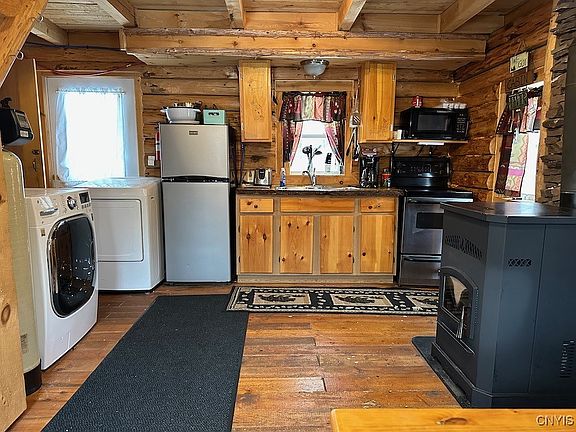 Tucked away among the trees, this charming log cabin home sits on over 10 acres of land, providing the ultimate in privacy. A new 12x20 deck invites you to unwind and enjoy the sights and sounds of nature. Inside, the home boasts numerous updates, including mini-splits for heating and air conditioning, a cozy pellet stove, insulated floors, and updated PEX plumbing, ensuring year-round comfort and convenience.  A newly added loft floor creates additional living space, perfect for guests or a personal retreat.
