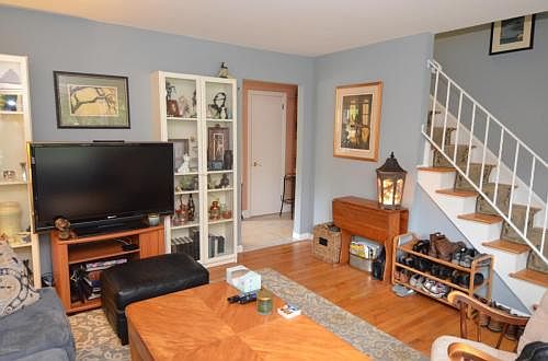 Enjoy townhome-style living in this 2 BR, 1.1 BA, 2,142 sf home on a quiet street. The 1st Floor features a sunny living room with hardwood floor, large eat-in kitchen, powder room, and laundry room. On the 2nd Floor there are 2 bedrooms with hardwood floors and multiple closets. The fully-finished lower level with family room offers a walkout to the terrace and yard. Minutes to everything, shops, restaurants, schools and train. Off-street parking. (Please note: Photos are of similar Unit A next door.