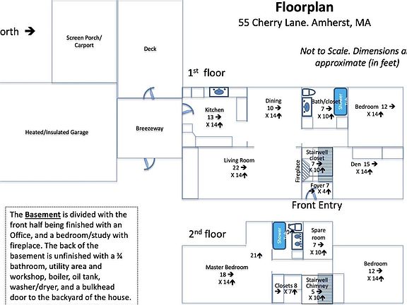 Attractive Cape in a friendly neighborhood within walking and biking distance to UMass/Amherst center. This well renovated home has three floors with 3 bathrooms and hardwood floors. The 1st floor has a spacious living room with an elegant brick fireplace, a den, a formal dining room that overlooks the large, park-like backyard, a first-floor bedroom, and a full bath with marble floors. The eat-in kitchen has ample cabinet space; some glass-fronted for display. An enclosed breezeway provides access to a heated, insulated garage, a deck, and a 3-season screened porch which doubles as a 3rd carport in winter. The 2nd floor has two large bedrooms, spacious closets, and views to the back and side yards. The bathroom has tile flooring and 2 sinks. A 10x10 ft. walk-in closet could be converted to a 4th bedroom if desired. The basement has a finished home office space with large windows and has a large bonus room with a second fireplace that could be converted into an additional bedroom.